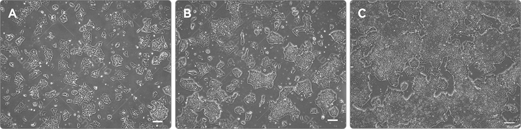 A, B, and C: Morphology of hiPSCs on days 1, 2, and 4 of culture, respectively. Scale bar: 200 μm.