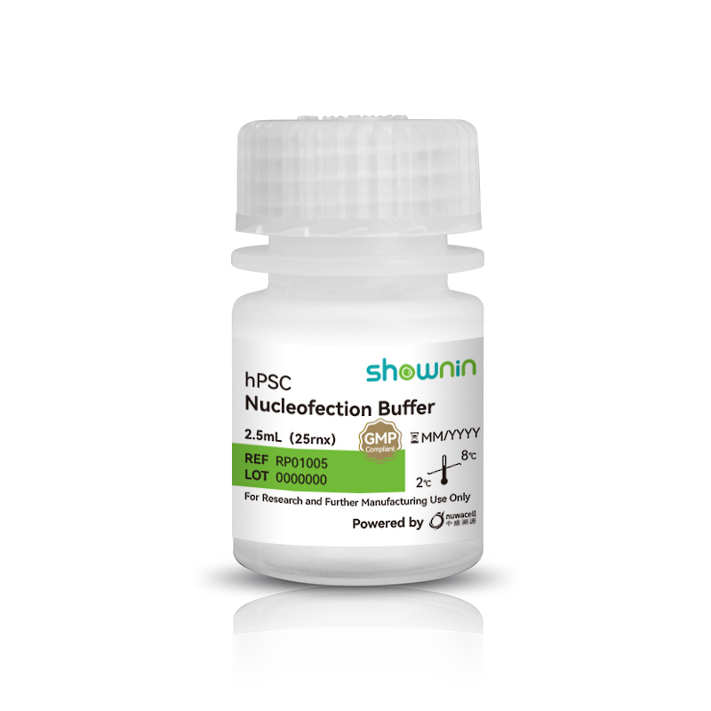 Shownin hiPSC/hESC Nucleofection Buffer (RP01005) is a solution specifically developed for electroporation of undifferentiated human pluripotent stem cells (iPSC, ESC) cultured in various medium system. It ensures stable and high transfection efficiency, maintains a high cell survival rate post-transfection, is non-toxic to cultured cells and has no impact on downstream experiments. It serves as the ideal solution for transfecting human pluripotent stem cells (iPSC, ESC).