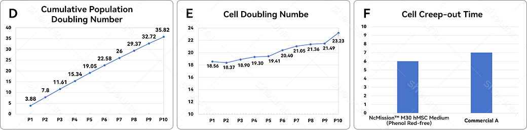 F: Illustration of the MSC creep-out time in NcMission™ M30 hMSC  Medium (Phenol Red-Free) compared to Commericial A Medium.