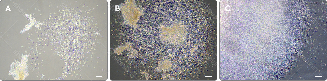 A, B, C: Cell morphology on day 6, 9, and 12 after isolation and seeding the tissue, respectively. Scale bar: 200 μm.