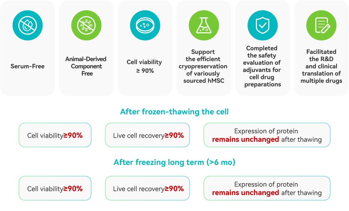 This product is a ready-to use, safe and efficient cryopreservation solution product with low DMSO content, all components are adjuvants/pharmaceutical grade, and the safety evaluation of adjuvants for cellular drug preparations has been completed. It has also facilitated the R&D and clinical translation of multiple products in the cell therapy field.