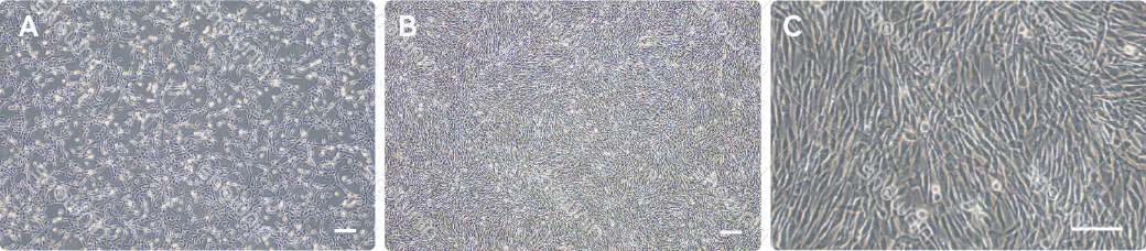 B, C: the hMSC Morphology of under the microscope on the 3rd day after cell thawing and passaging, respectively.