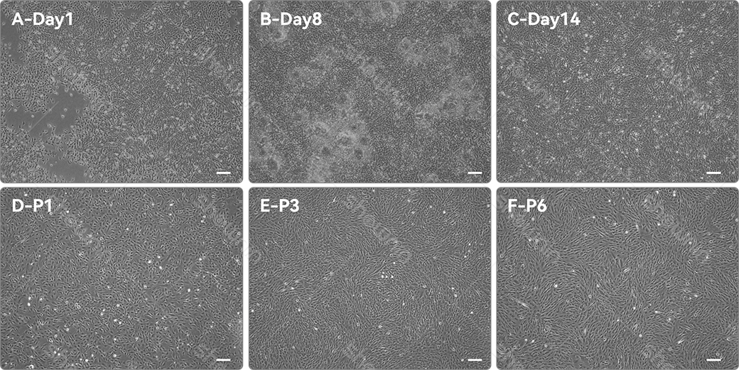 D, E, F: continuous culture of hPSC-MSC, showing the Day 3 morphology of P1, P3, and P6 generation cells respectively. Scale bar: 200 μm.