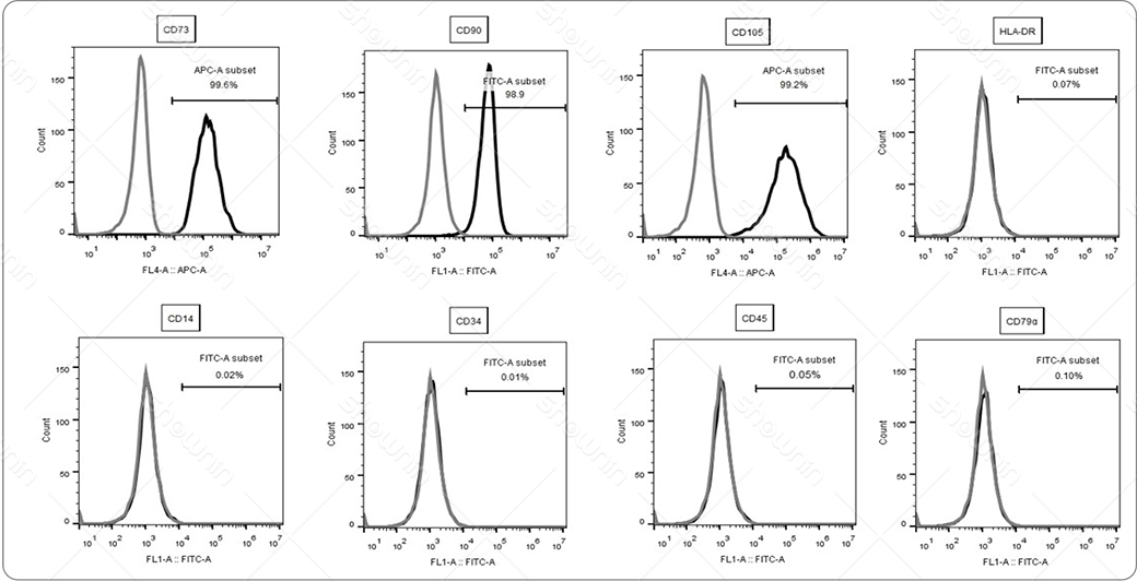(The picture above shows the results of flow cytometry analysis, the light gray line is the alloantibody negative control, and the black line is the expression of MSC cell surface markers)