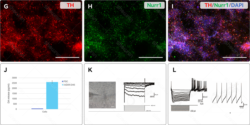 K, L: Patch-clamp test results of hPSC-derived mature midbrain dopaminergic neurons (mDAN, Day 42).