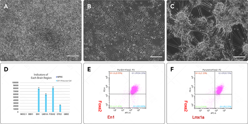 With hPSC-mDAP Differentiation Kit, researchers can obtain high-purity mDAP  with >90% Lmx1a+/ Foxa2+/ En1+ expression. The hPSC-mDAN Maturation Medium transforms mDAP into mature mDAN (TH+/ Nurr1+) with specific electrophysiological activity and dopamine release function. The differentiated human mDAP and mDAN can be used in scientific research on neurodegenerative diseases, drug screening, and cell transplantation of Parkinson's disease models.