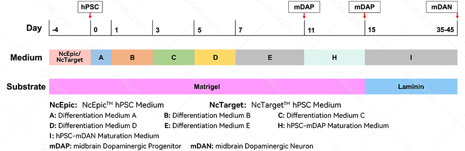 • hPSC-Dopaminergic Neuron Differentiation Kit(RP01017)provides a holistic solution for the highly efficient differentiation of human pluripotent stem cells (hPSC) into mature mDAN (midbrain dopaminergic neurons). This comprehensive kit comprises the hPSC-mDAP Differentiation Kit, hPSC-mDAP Maintenance Medium, and hPSC-mDAN Maturation Medium, offering a flexible selection tailored to your research needs.