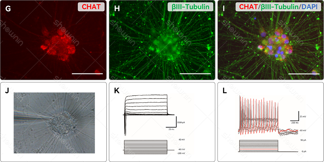 J, K, L: Patch-clamp electrophysiological detection results of hPSC-derived mature motor neurons (Day 30).