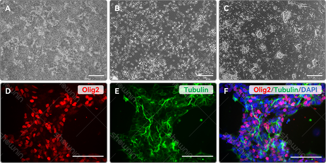 D, E, F: Immunofluorescence detection of MNP (Day 9) cell-specific markers (Olig2, Tubulin). Scale bar: 200 μm.