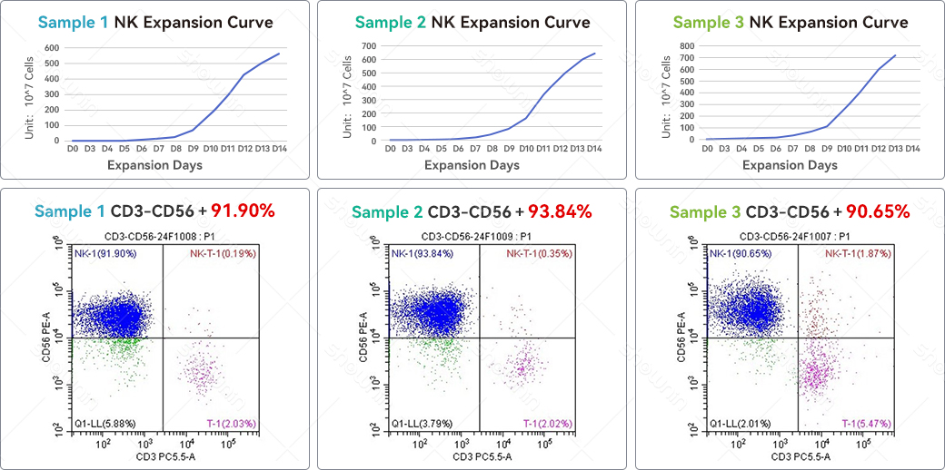 *All samples started with 10–20 million fresh/frozen PBMCs, using the ncKnight™ NK Expansion Factor Kit. After 13–14 days of expansion in a 2 L culture system, 5–7 billion NK cells can be harvested in a single collection.