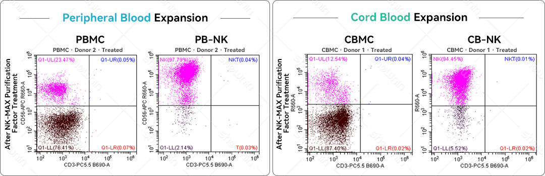 Features:Serum-Free System: Contains no serum or serum substitutes. Simple Expansion System: No need to add additional autologous plasma or serum substitutes. High Expansion Efficiency: 3–4 billion NK cells can be harvested per liter of culture medium. High NK Purity: After expansion, NK cell purity (CD3-CD56+) can exceed 90%, and with the NK-MAX purification factor, it can reach up to 99%; Suitable for peripheral blood and umbilical cord blood samples , including both fresh and frozen samples.