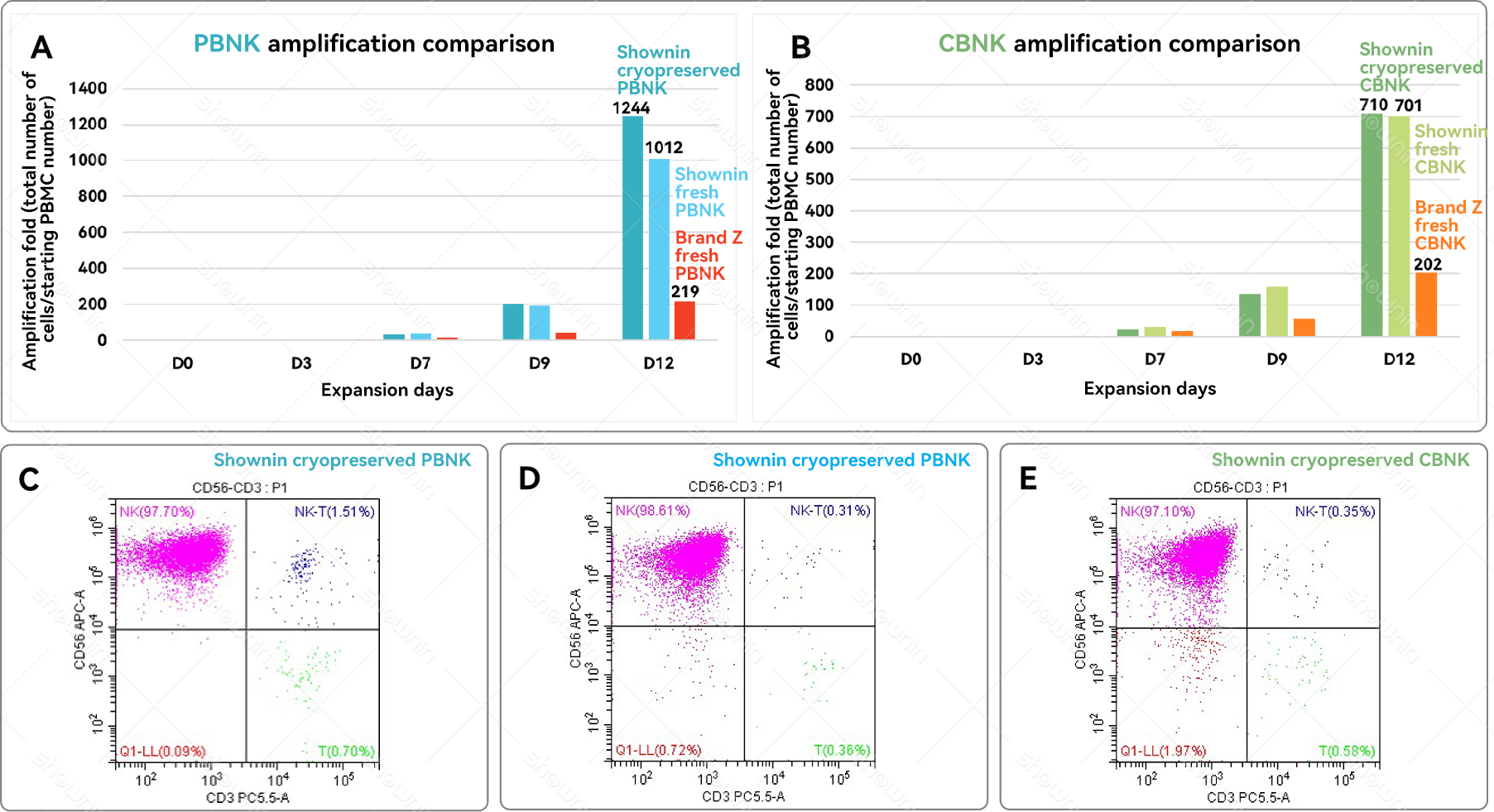 E: Positive rate of cryopreserved umbilical cord blood NK cells expanded in the shownin's system.(Day 12)